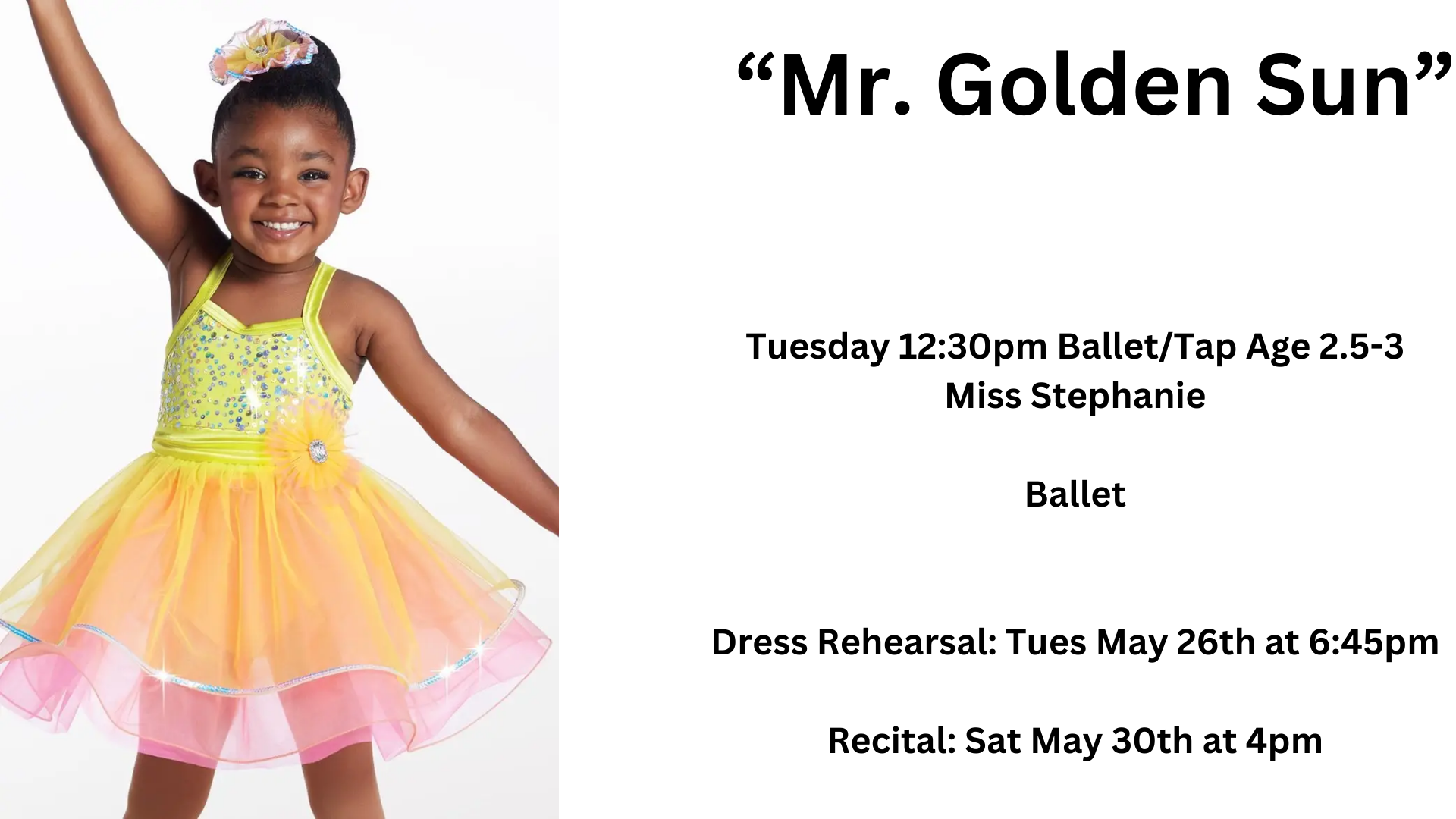 Tuesday 12:30pm: Ballet/Tap Age 2.5-3- Miss Stephanie