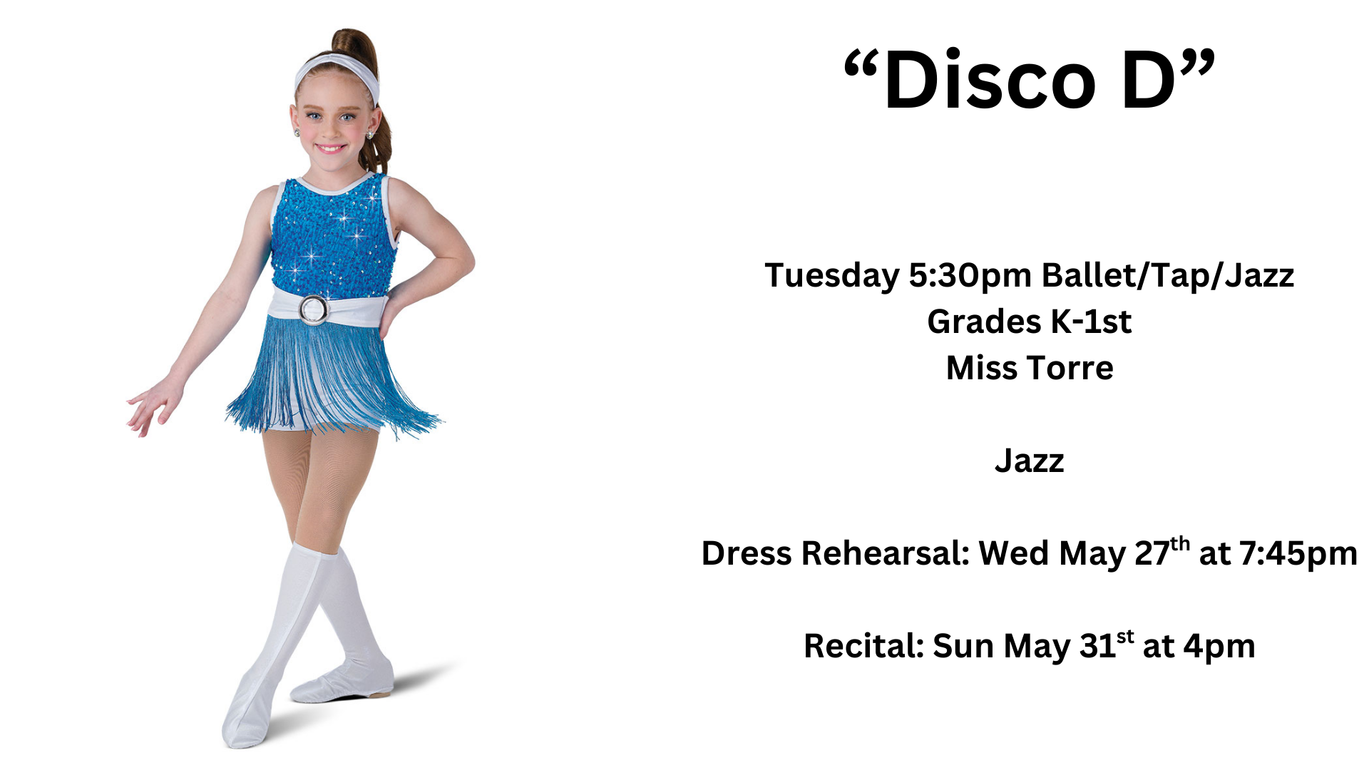 Tuesday 5:30pm: Ballet/Tap/Jazz Grades K-1st- Miss Torre & Miss Gia