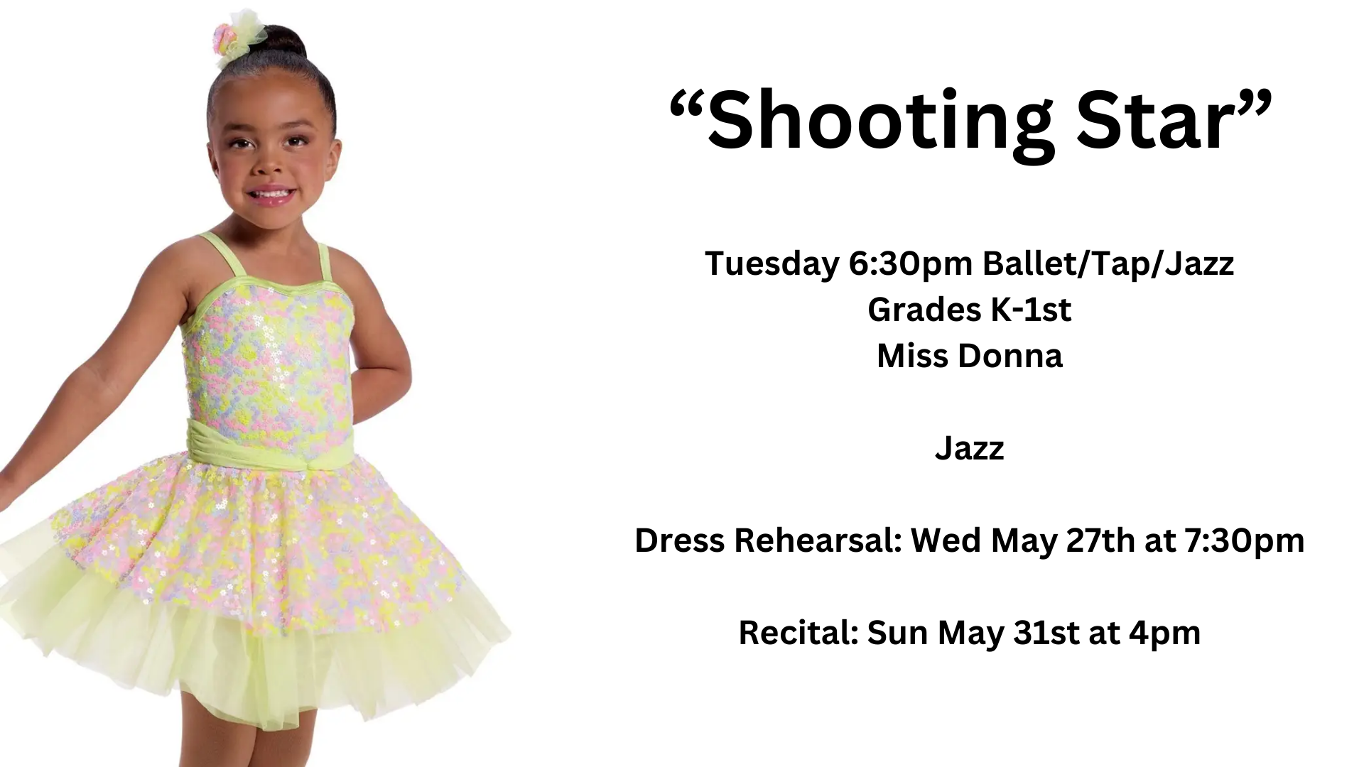Tuesday 6:30pm: Ballet/Tap/Jazz Grades K-1st- Miss Donna